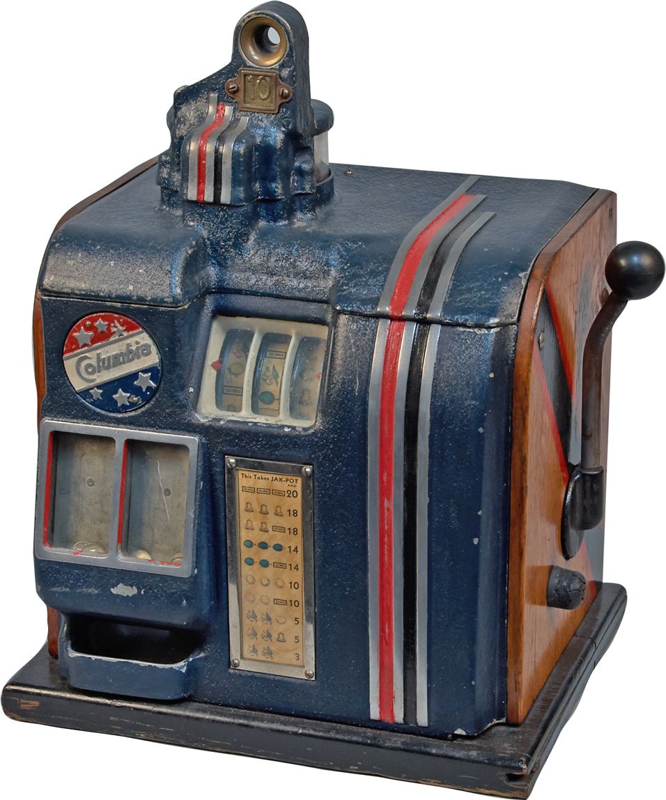 Groetchen Columbia Slot Machine Twin Jackpot 10 Cent Small Table Top Model. Condition is 'Used'. Shipped with FedEx Ground or FedEx Home Delivery This was in family was my dads selling as is know very little about it,ask questions will try to answer them,Put 2 dime in the machine and looks like it plays,Sending three manuals that he had with this. The first mechanical slot machine was developed by Charles Fey in 1895. This machine already featured the familiar spinning reels with fruits and card characters. Fey later worked with the Mills company to produce a wider line of machines as they grew in popularity. Jennings, another early slot machine manufacturer.